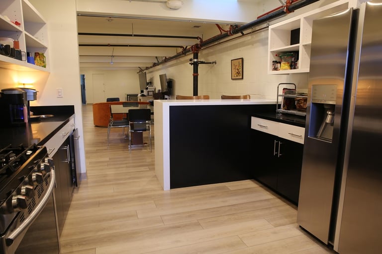 The VIP Loft at Mary Pickford Film Studios offers a spacious, versatile environment designed to support both talent and production teams. It features a fully functional kitchen and bar area, making it ideal for private craft services, along with four separate bathrooms to accommodate VIPs and crew. The loft includes a massive living room and common area that can serve as a private retreat for talent or a central hub for production, complete with an entertainment center, comfortable couches and dedicated work areas. With ample closet space and six private rooms, the VIP Loft can be used for filming, hair and makeup, talent holding, rehearsals, production offices, podcasts and can also function as a private talent space or be dressed as a bedroom, office or prison room set.
